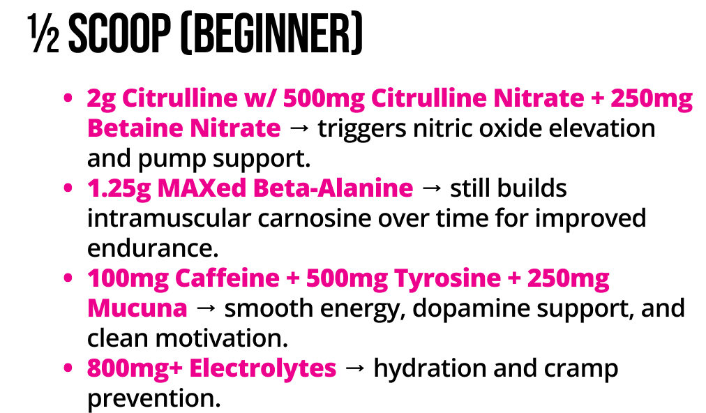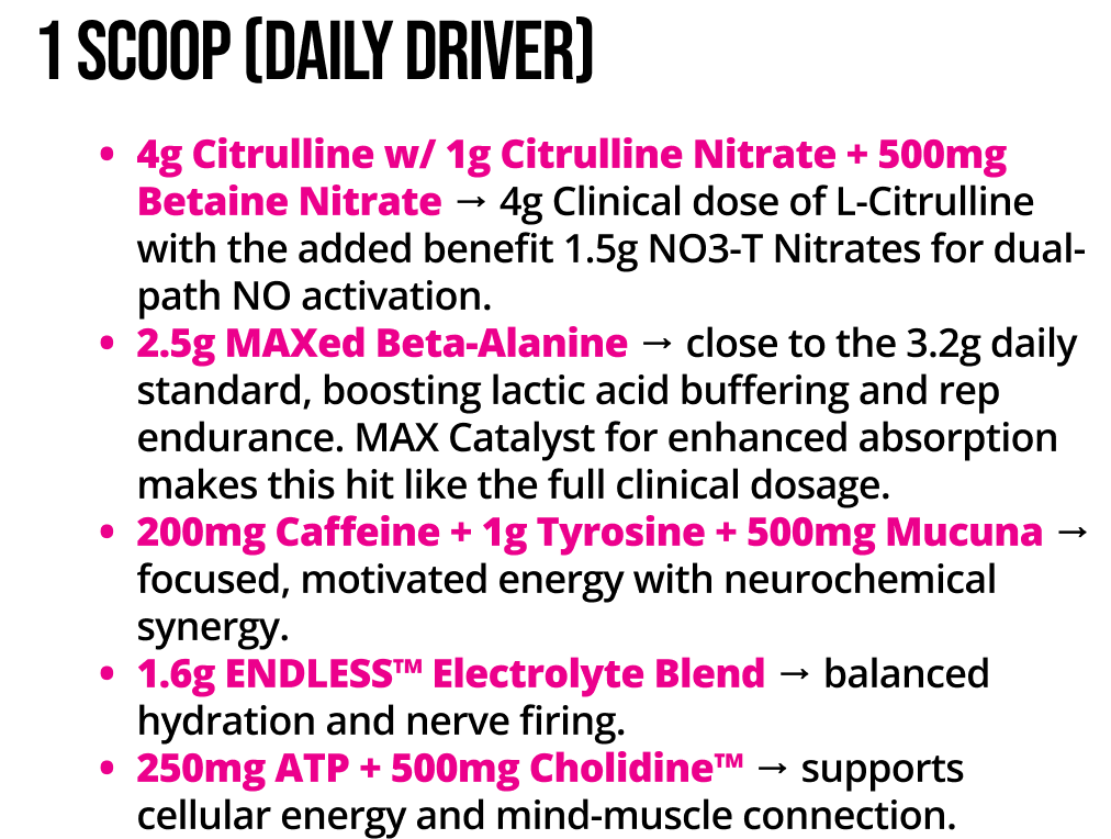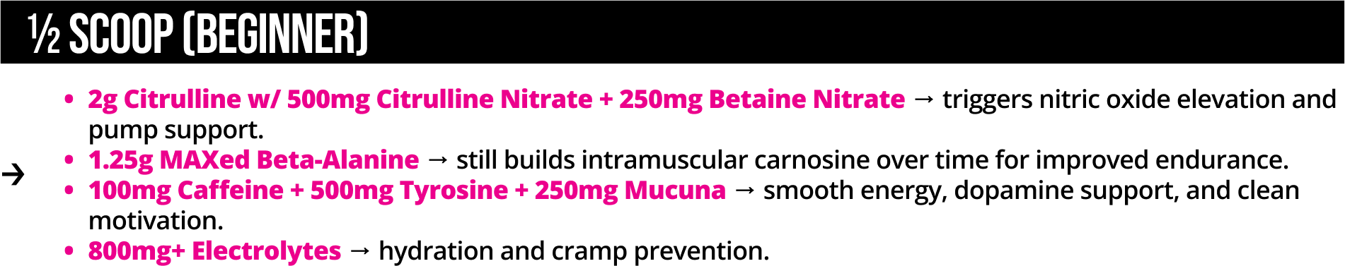 · 5g Beta-Alanine → elevates muscle carnosine, buffers fatigue-causing hydrogen ions.