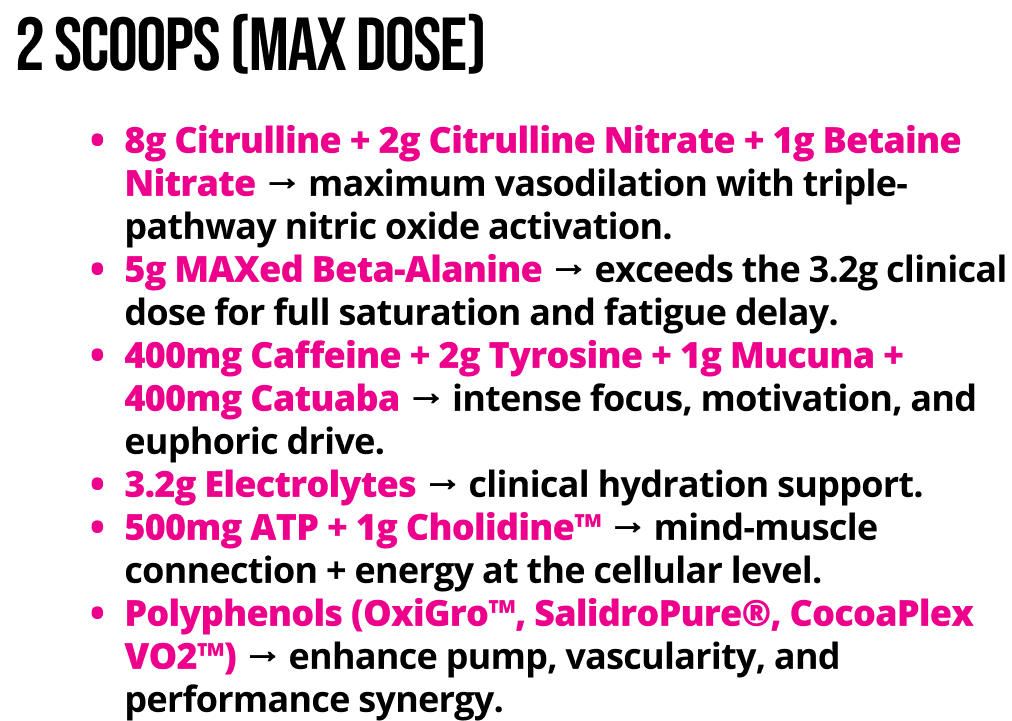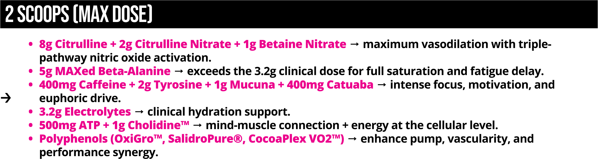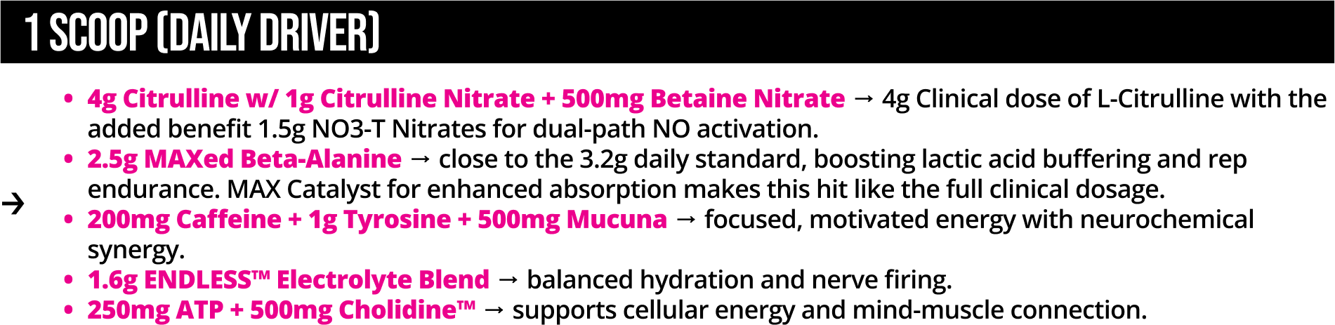 · 8g Citrulline w/ 2g Citrulline Nitrate (NO3-T®) → fuels endogenous arginine → NO synthase AND nitrate → nitrite → NO conversion.