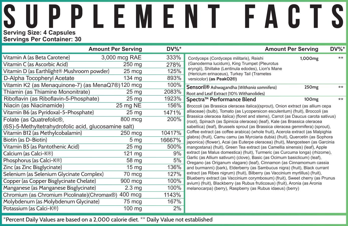 This vegan multivitamin is a comprehensive blend of 22 essential vitamins and minerals (19 offer 100% or more of your recommended daily value), PeakO2® organically-grown combo of six medicinal mushrooms, Sensoril® Ashwagandha, and Spectra™ antioxidant blend.