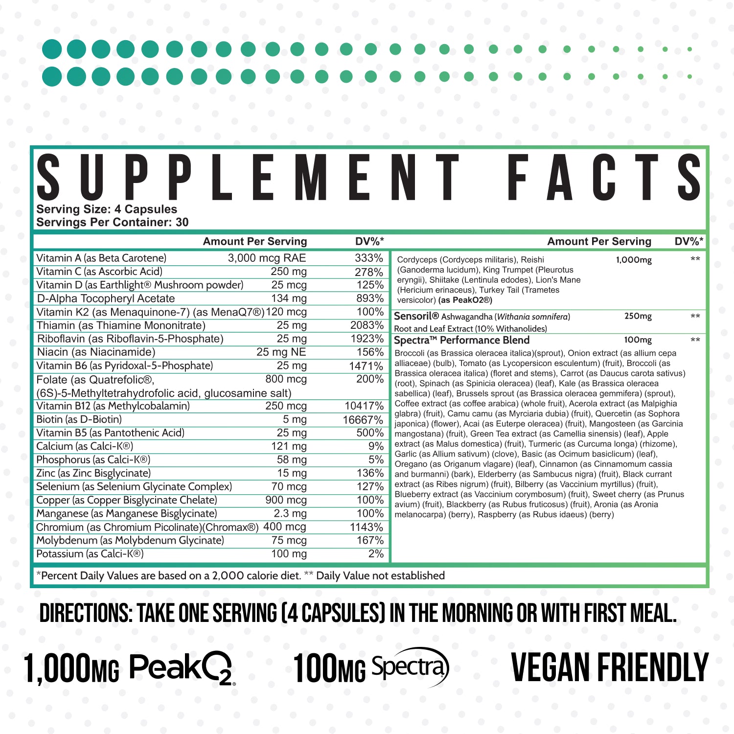 This vegan multivitamin is a comprehensive blend of 22 essential vitamins and minerals (19 offer 100% or more of your recommended daily value), PeakO2® organically-grown combo of six medicinal mushrooms, Sensoril® Ashwagandha, and Spectra™ antioxidant blend.